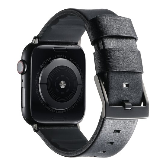 Leer + siliconen band - Zwart + zwarte aansluiting en gesp - Geschikt voor Apple Watch 44mm / 45mm / 46mm / 49mm