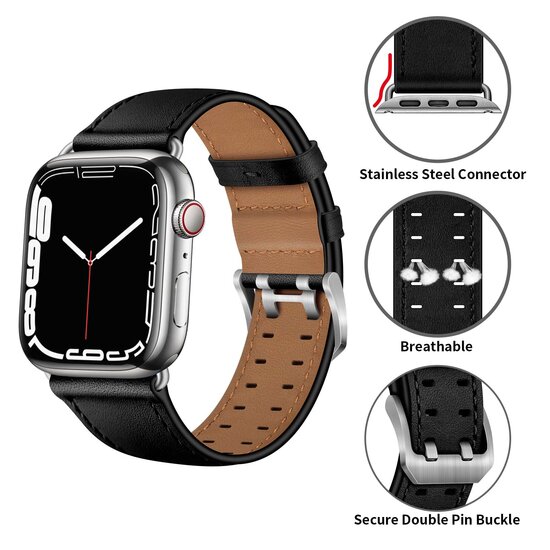 Leren band met twin gesp - Zwart met zilveren gesp - Geschikt voor Apple Watch 38mm / 40mm / 41mm / 42mm